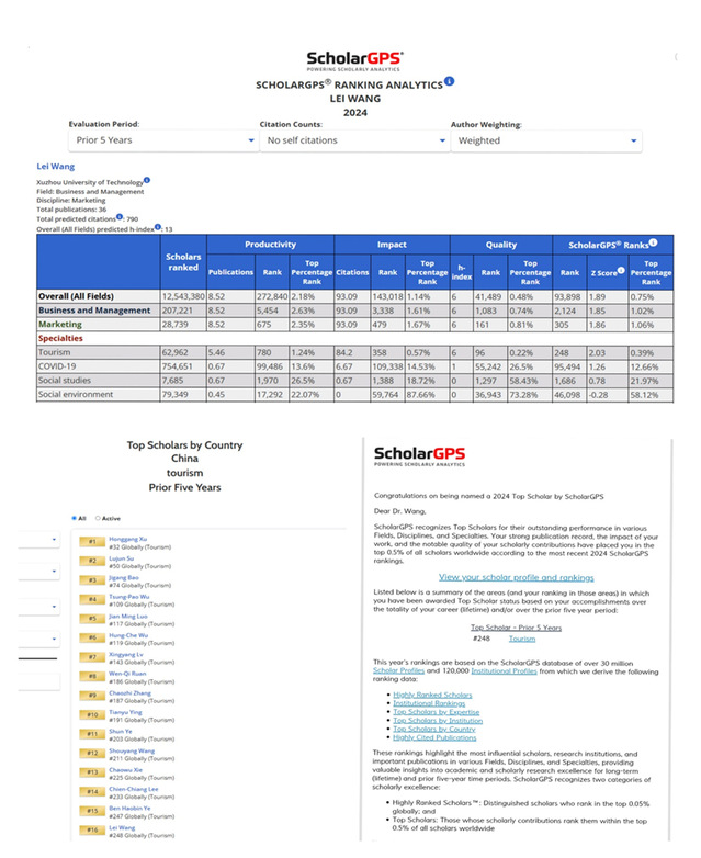 除此榜单外,王磊老师在2024年ScholarGPS发布的近五年全球前0.5%顶尖学者排名是:旅游管理专业全球第248名、中国第16名!
