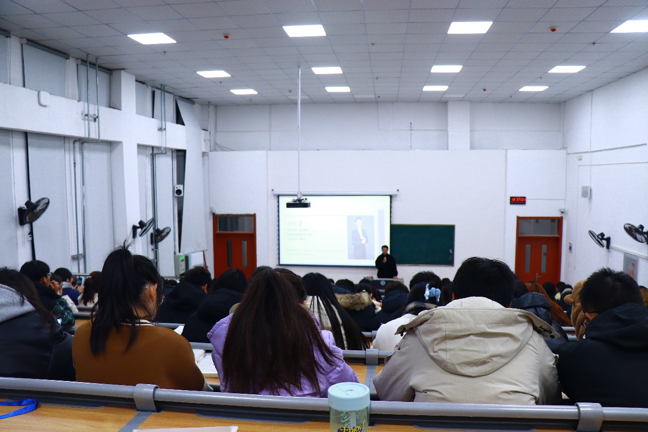 讲座开始后,饶岑龙学长着重向大家分享了自己过去三年大学期间的蜕变历程。通过讲述自己在大学期间自学Python编程语言的体会,建议同学们大学期间要养成自学良好习惯;通过分享带队参加第十二届电子商务“创新、创意及创业”挑战赛最终获校三等奖的经历,引导同学们要夯实专业知识,积极参加各类学科竞赛;通过分享担任校园美团优选团长期间的趣事,告诫同学们要对未知保持期待,努力提升个人团队管理和领导才能。