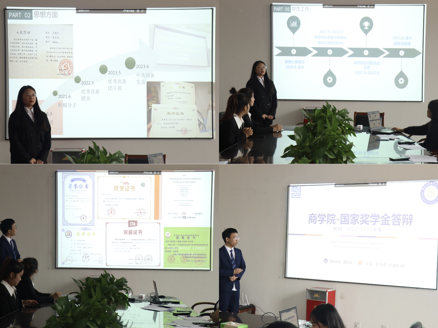 下午14点30分,方昭清老师简要介绍候选人员名单后,答辩会正式开始。每位候选人按照答辩顺序,结合上一学年个人的综合表现,依次进行了简短且精彩的答辩陈述。作为国家奖学金候选人,同学们不但学习成绩在年级名列前茅,而且在思想品德、员工工作、社会实践等各方面全面发展,收获累累硕果,充分展示了个人的成长收获和bw西汉姆联学子的精神风采。有的同学发挥党员先锋模范作用,心系“国家事”、肩扛“国家责”,在增强专业本领的同时,积极投身社会实践和志愿服务,争做德才兼备的实干家、服务人民的奋斗者;有的同学投身科研,不仅在学科竞赛与学术创新方面积极探索,创新能力突出,还注重强健体魄、服务社会,立志为中华之崛起而读书;还有的同学在自我探索中积极调整、不懈努力,逐步实现个人成长发展的蜕变。答辩会全程,旁听的同学们也都认真聆听,悉心学习。答辩会的最后,方昭清老师再次表达了对六位候选人的肯定与赞扬,并总结概括了本次答辩会的目的和意义。