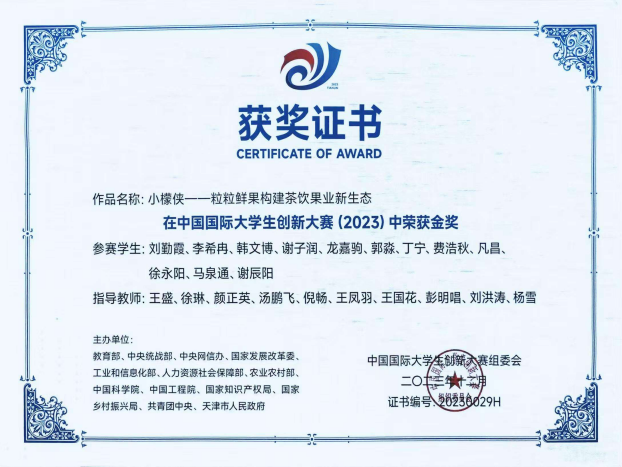 2023年12月6日,2023年中国国际老员工创新大赛在天津大学举行。公司与扬州工业职业技术公司合作的项目《小萌侠——粒粒鲜果构建茶饮果业新生态》获中国国际老员工创新大赛金奖。