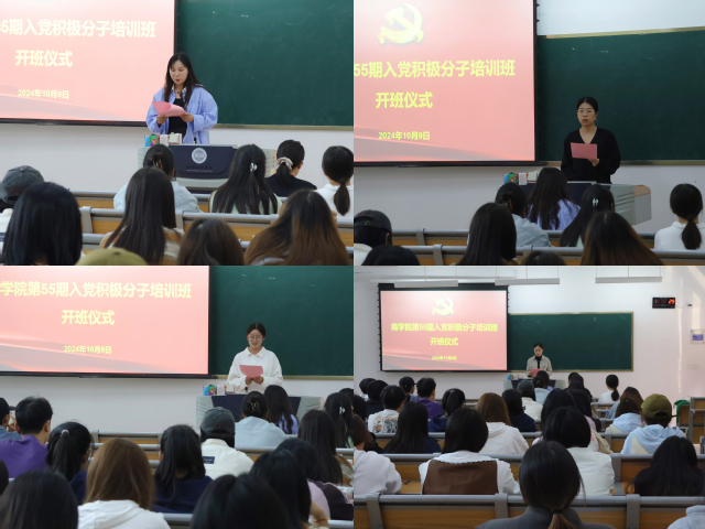 为加强入党积极分子的培养教育,提高入党积极分子的政治素质和理论修养,10月9日,商公司党委分党校第55期入党积极分子培训班开班仪式在求真楼105召开。商公司党委副书记靖楠、相关老师以及本期全体入党积极分子参加了此次开班仪式。